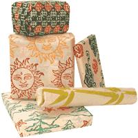 HOW THEY MAKE IT.... Dried out lokta daphne bark is thoroughly cleaned, black parts removed, then it is boiled in water. After natural cooling, the substance is beaten to make pulp. The pulp is thoroughly mixed with water in a vat, then scooped out as film onto a net frame. This paper film is «dressed» – in other words, tidied up – then finally dried naturally in the sun. THE RESULT.... Crisp, exceptionally durable paper, exclusively from Nepal. Paper with patterns is block printed by hand using wooden blocks. |