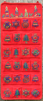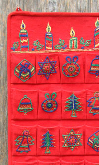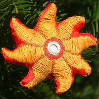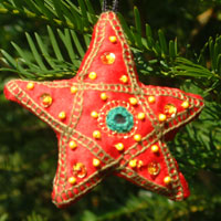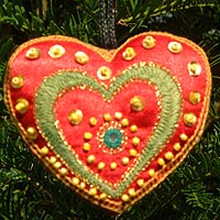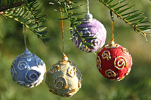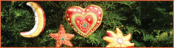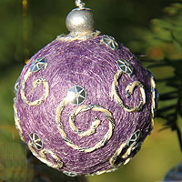 Four decorative balls hand embroidered with spiral designs and sequins.