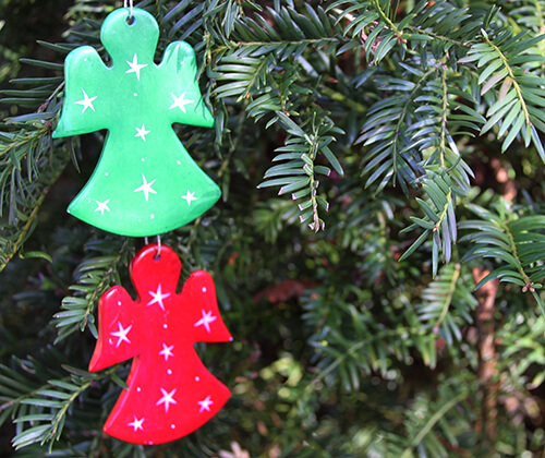 Two angels sold as a pair, one red the other green, which are thin cuts of white stone from Kisii county, western Kenya.