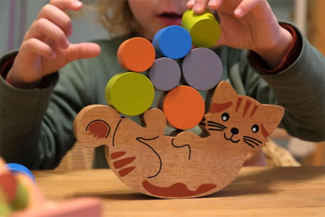 All about balance. Takes perseverance and a steady hand to keep the coloured cylinders from rolling off the rocking cat.