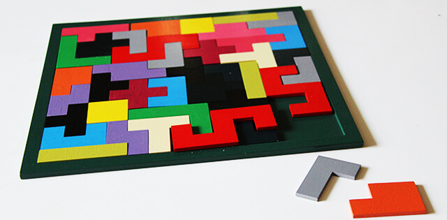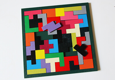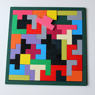 Your task is to assemble 40 jigsaw pieces supplied in 15 different shapes and various colours, to complete the surface of the frame.