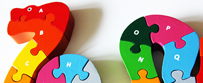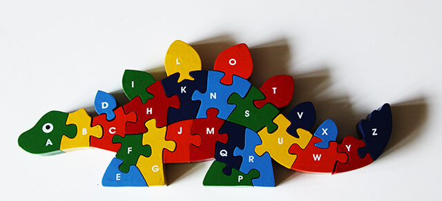 Twentysix pieces marked with the letters of the alphabet, and an arrangement of bright colours, form the unmistakable shape of our long-gone predecessors.